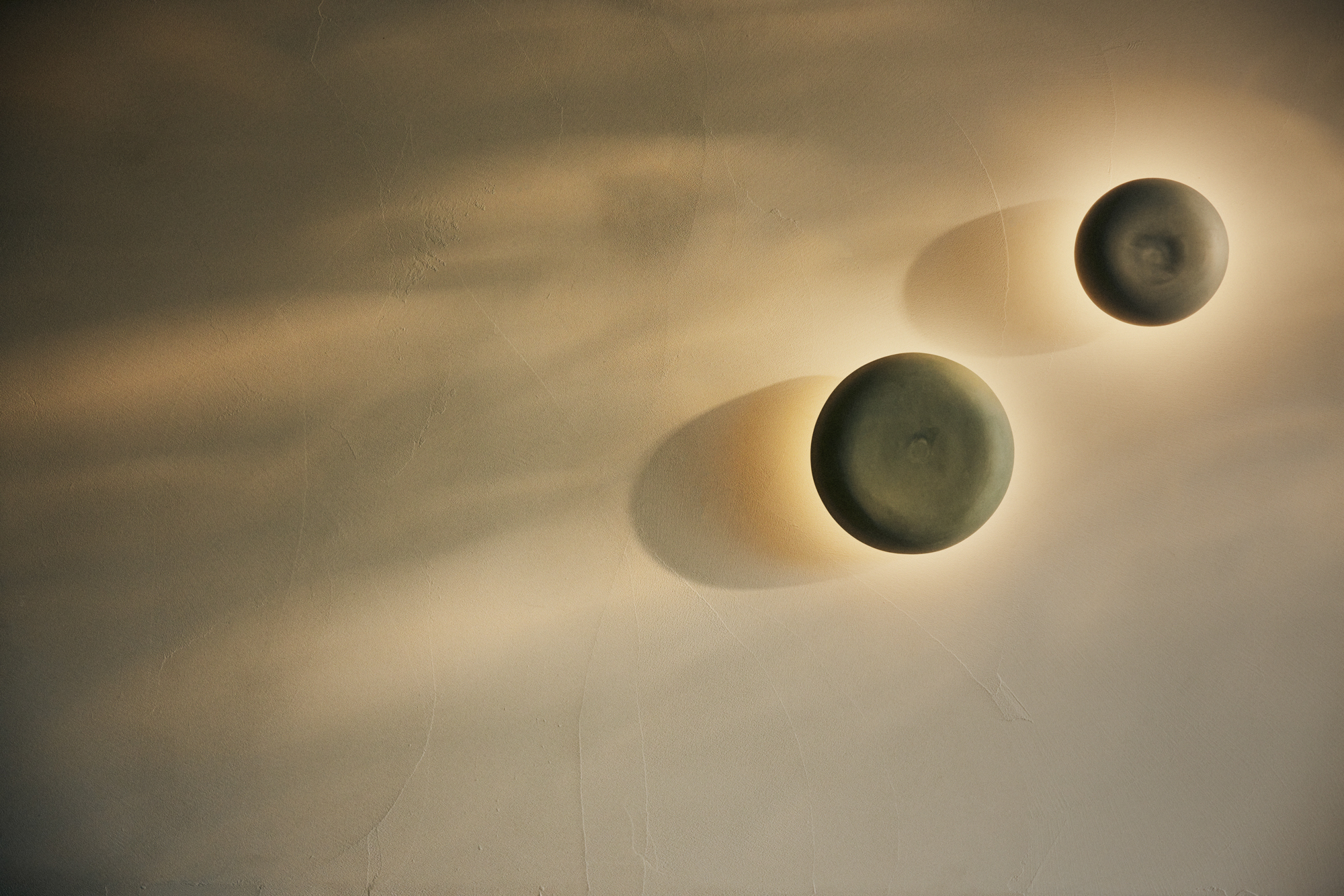 A circular wall light crafted from Australian porcelain, designed to evoke the soft glow of moonlight. Set slightly away from the wall, ECLIPSE casts a warm, ambient halo in all directions.